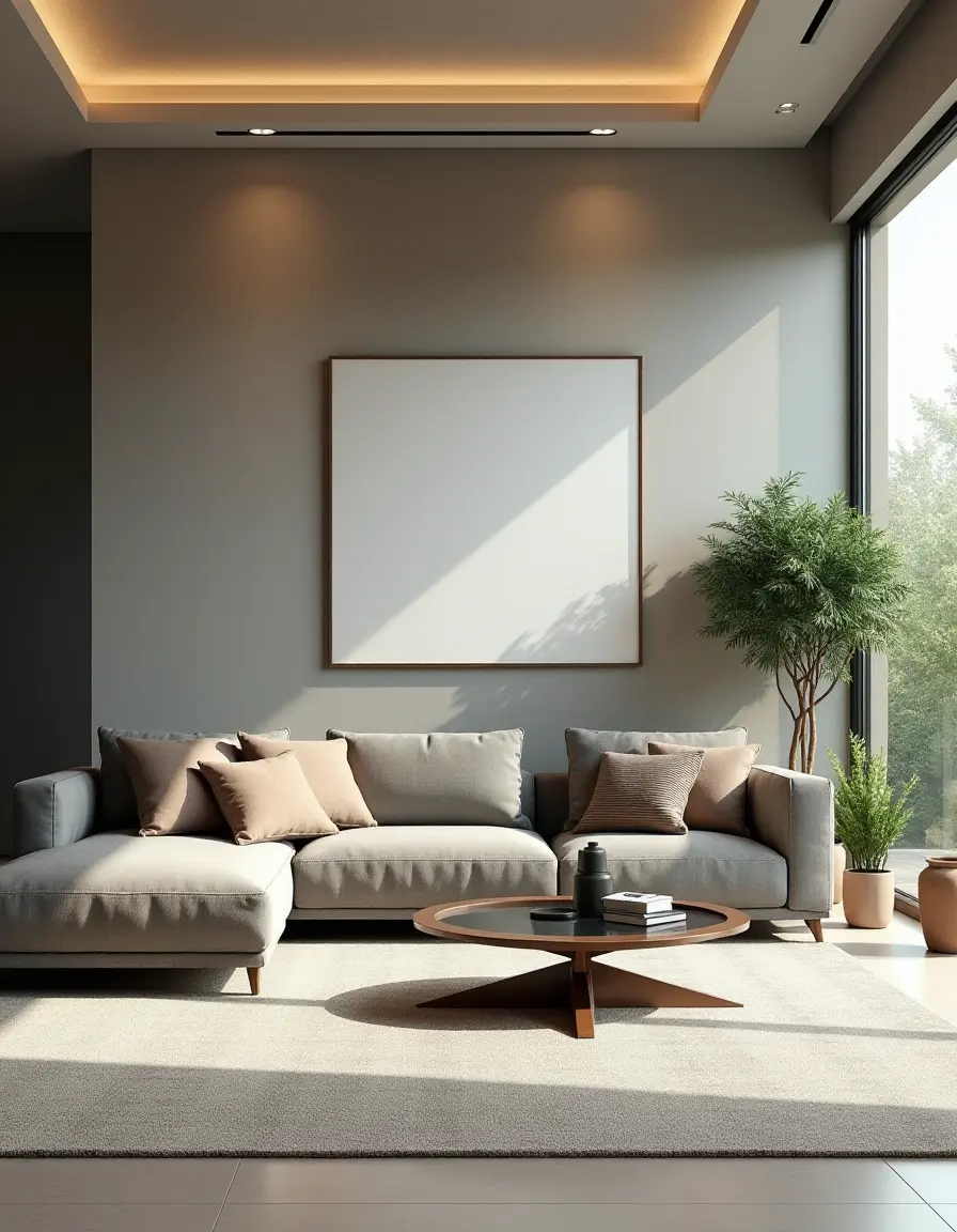 The living room features a minimalist design with a smooth concrete accent wall acting as a stunning backdrop. A low-profile gray sectional sofa is positioned at an angle, adorned with subtle texture throw pillows in muted earth tones, inviting relaxation. In front of the sofa, a sleek, glass coffee table with a geometric metal base rests on a plush area rug in a soft, neutral shade, providing warmth and softness to the space. Floor-to-ceiling windows allow natural light to flood in, highlighting a collection of potted plants in ceramic planters that add a touch of green and life to the modern aesthetic. The overall ambiance is enhanced by dimmable recessed lighting that illuminates the room without impeding the clean lines and quality materials that define this contemporary style.