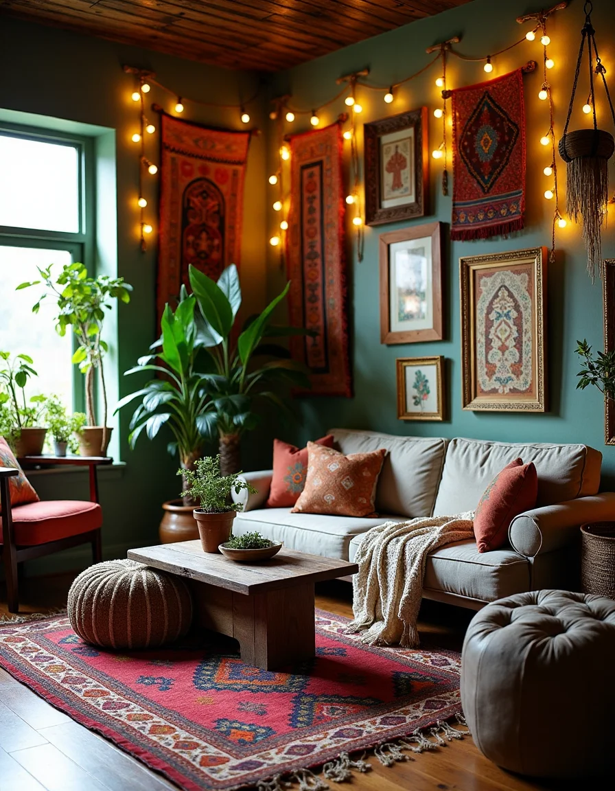The living room exudes a bohemian vibe, characterized by an eclectic mix of ethnic decor and vintage furnishings. A large, colorful area rug with intricate geometric patterns anchors the space in the center, while a low, reclaimed wood coffee table is surrounded by a combination of mismatched vintage poufs and a distressed, oversized Moroccan leather ottoman. The walls are adorned with an array of framed cultural artwork, including vibrant tapestries and handcrafted macramé hangings, creating a stunning gallery effect. Various potted plants in decorative pots bring life to the room, accompanied by a hanging planter that cascades greenery down from a ceiling hook. Soft textiles such as patterned throw blankets draped over a plush, faded velvet sofa add layers of comfort, while the warm glow of amber-toned fairy lights strung across the window frames provides a cozy atmosphere during the evenings.