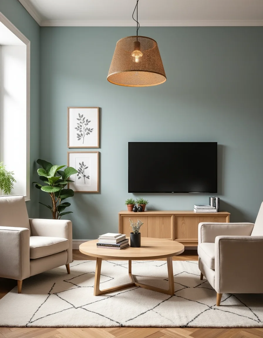 The living room exudes a cozy Scandinavian ambiance, featuring soft pastel colors like muted blue and light grey, accented with natural warm wood tones. A spacious light oak coffee table is centrally placed on a plush, off-white rug adorned with subtle geometric patterns. Flanking the sides of the bay window are two minimalist beige armchairs with clean lines, perfectly placed to create a reading nook bathed in natural light. A sleek, low-profile media console crafted from light birch wood sits against one wall, adorned with potted greenery and neatly arranged books, while a series of framed botanical prints hang above it. Soft ambient light glows from a statement pendant lamp made of rattan, adding warmth and an inviting feel to the overall practical and uncluttered design.