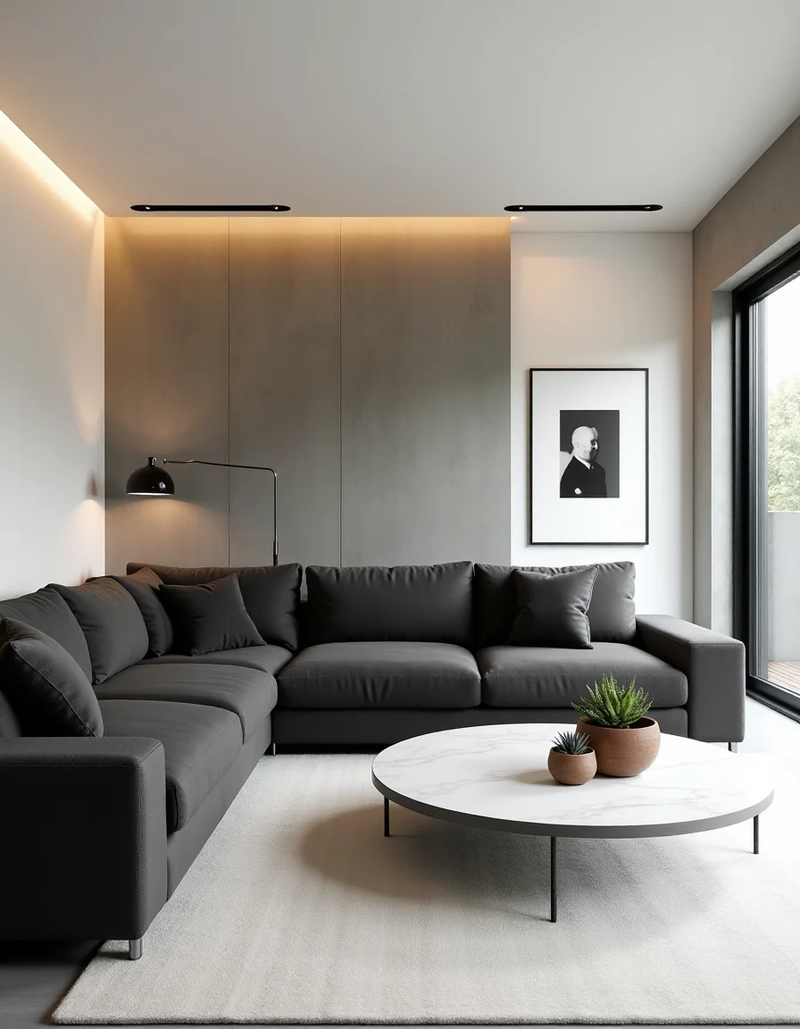 This minimalist living room embraces a serene aesthetic, featuring clean lines and an emphasis on negative space. A large, charcoal gray sectional sofa anchors the room, arranged to foster conversation while allowing for ample open floor space. Positioned beside the sofa is a sleek, white marble coffee table, topped with a single succulent plant in an earthenware pot, enhancing the monochrome palette. The walls are adorned with simple black and white artwork, while a polished concrete accent wall provides a striking backdrop, complementing the minimalist vibe. Warm white LED lighting subtly illuminates the area, highlighting the room’s expansive feel and inviting warmth.