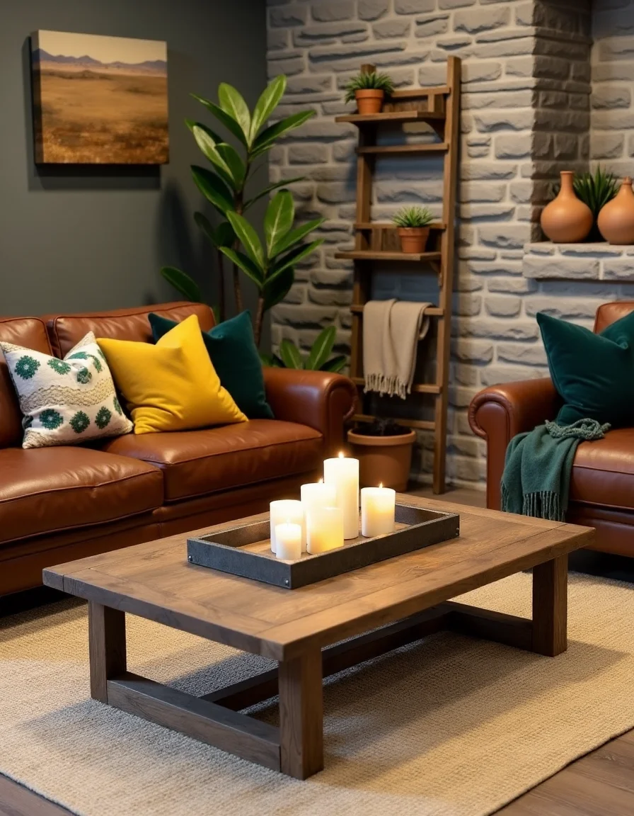 The living room exudes a warm and inviting rustic charm, anchored by a large, reclaimed wood coffee table adorned with a weathered metal tray holding an assortment of candles in varied heights. A plush, deep-brown leather sofa is positioned against a stone facade wall that showcases natural slate tiles, creating an earthy backdrop. Layered textiles add comfort and depth, with a woven cream area rug underfoot, complemented by a mix of patterned throw pillows featuring mustard yellows and dark greens. In one corner, a vintage ladder leans against the wall, adorned with cozy throws, while a collection of potted succulents and a handmade clay vase complete the organic decor, establishing a serene and homely ambiance.