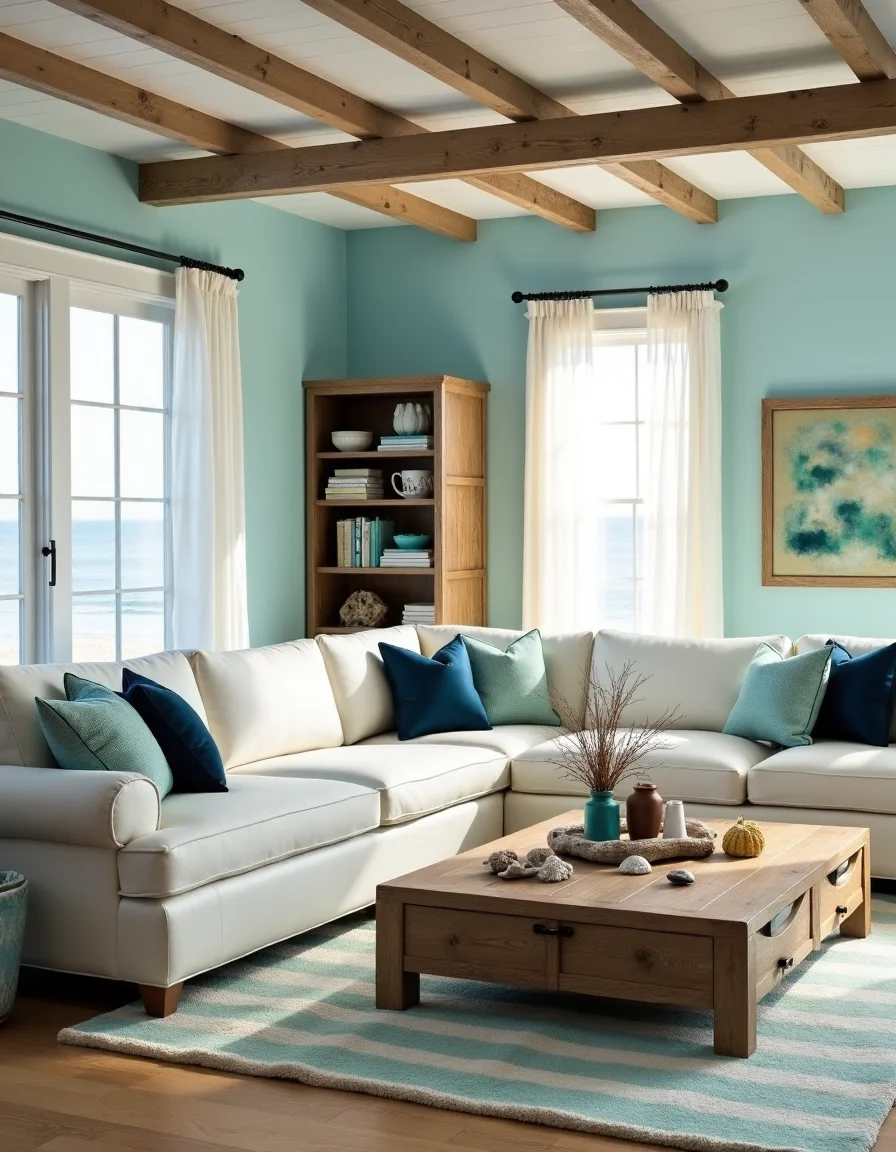 The seaside living room emanates a fresh, breezy vibe with its pale blue walls reminiscent of the ocean's hues. A large, plush off-white sectional sofa is elegantly placed in the center, adorned with an assortment of navy and seafoam green throw pillows that add a pop of color. Beneath the sofa lies a soft, striped area rug that incorporates sandy beige and ocean blue tones, anchoring the space. Weathered wooden beams run across the ceiling, adding to the rustic charm, while a reclaimed wood coffee table in the center features nautical decor elements like a driftwood centerpiece and seashells scattered about. A tall bookshelf against one wall displays an eclectic mix of vintage books and coastal-themed trinkets, complemented by gossamer white curtains that flutter gently with the ocean breeze.