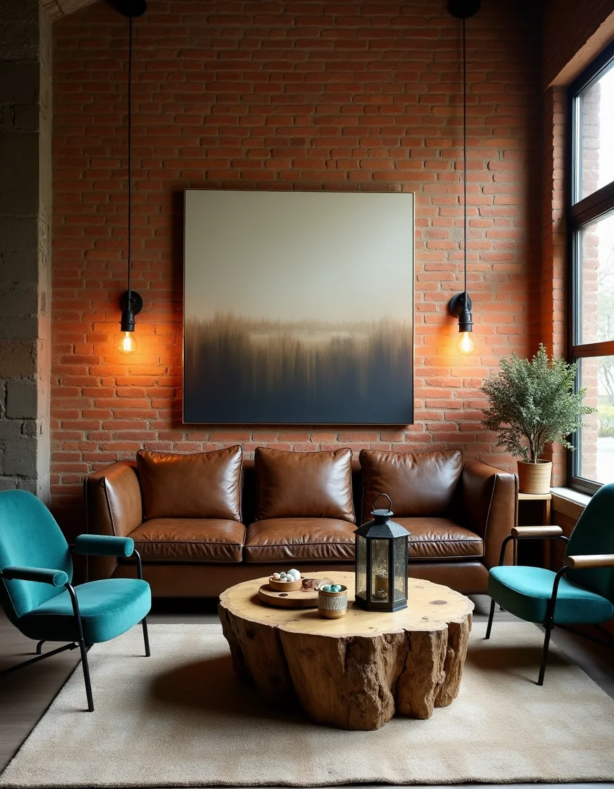 The living room boasts an industrial style characterized by exposed burnt brick walls that provide a rugged, warm backdrop. In the center, a large, distressed leather sofa in rich dark brown complements an assortment of mismatched vintage chairs: a vibrant teal armchair paired with a sleek black metal-framed one. A large wooden coffee table, made from reclaimed wood with iron legs, anchors the seating area and is adorned with an array of industrial-style decor pieces, including a rustic metal lantern and a cluster of reclaimed wooden coasters. Overhead, pendant lights with Edison bulbs hang from brushed steel fixtures, illuminating the space with a soft, inviting glow, while a large abstract painting in muted earth tones adds a splash of contemporary artistry to one wall.