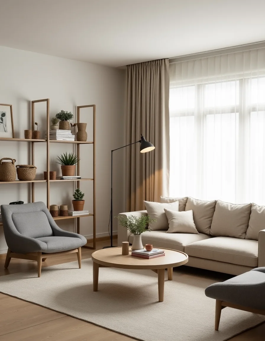 The living room boasts a serene Scandinavian aesthetic, characterized by its functional furniture and calming pale color palette. A large, light oak coffee table sits centrally amidst a soft, off-white area rug, surrounded by a pair of minimalist gray fabric armchairs and a cozy beige sectional sofa adorned with plush, muted cushions. A strategically positioned floor lamp with a slender design illuminates the space, while natural light floods in through expansive, sheer linen curtains draping the large window. Decor elements include a wooden shelving unit showcasing an assortment of potted succulents, art books, and woven baskets, creating a harmonious blend of charm and organization within the inviting atmosphere.
