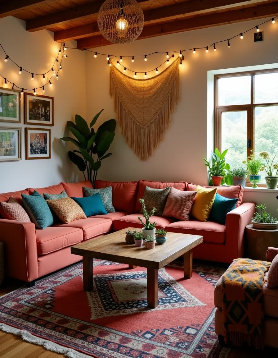 The living room exudes a warm bohemian vibe, filled with an eclectic mix of textures and colors. A plush, deep coral sectional sofa is adorned with an array of patterned throw pillows in hues of teal, mustard yellow, and burnt orange, creating a cozy and inviting atmosphere. In the center, a vintage handwoven area rug in shades of red and blue anchors the space, surrounded by a cedar coffee table decorated with potted succulents and an assortment of artisanal coasters. A low, wooden side table draped with a vibrant Persian shawl holds a collection of colorful ceramic mugs, while strings of fairy lights hang from the ceiling, casting a warm glow and accentuating the eclectic wall decor of macramé hangings and framed travel photographs.