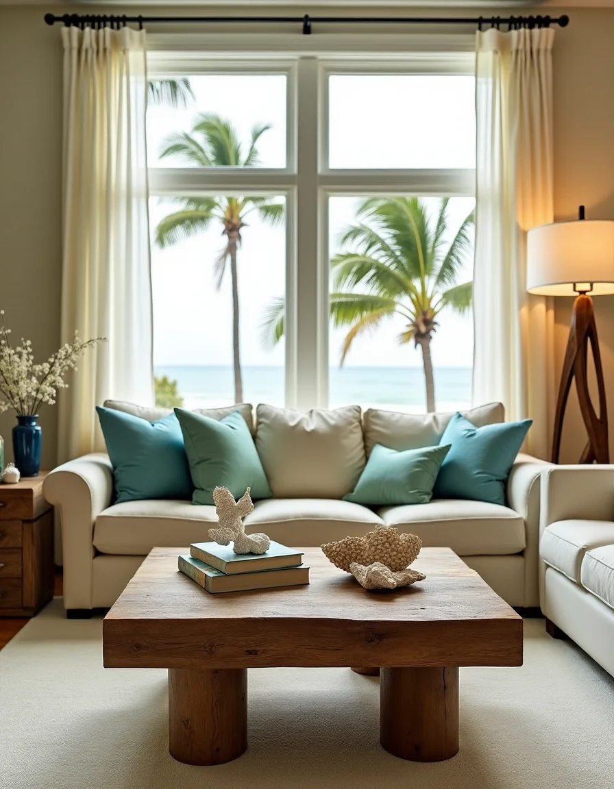 The living room exudes a warm seaside ambiance, where the gentle hues of beige dominate in both color and vibe. A pair of large, floor-to-ceiling windows floods the space with natural light, offering a spectacular view of gently waving palm trees outside. A plush beige sectional sofa is layered with soft, aqua-blue throw pillows that resemble ocean waves, while a creamy white area rug mimics sandy shores beneath a rustic, reclaimed wood coffee table adorned with seashells and a few coastal novels. In one corner, a tall driftwood floor lamp casts a soft glow, and delicate curtains with a sheer, linen feel billow slightly in the breeze, enhancing the refreshing beachy atmosphere.