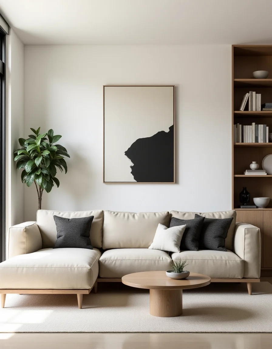 The living room embodies a minimalist ethos, featuring a seamless blend of comfort and simplicity. A large L-shaped sofa in soft beige linen occupies one corner, adorned with a few textured charcoal gray throw pillows that add subtle contrast without overwhelming the space. A sleek, low coffee table made of natural oak rests center-stage, while a single potted snake plant adds a touch of greenery next to it, balancing freshness with functionality. The walls are painted a soft white, complementing an open shelving unit housing a few well-chosen art books and minimalist decorative objects in muted tones. A large, abstract black-and-white artwork hangs above the sofa, creating a focal point that enhances the uncluttered aesthetic of the room.