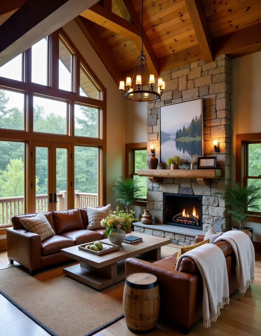 The living room is a cozy haven embodying rustic charm with soaring ceilings clad in rich, exposed wooden beams that provide an earthy warmth to the space. A stately stone fireplace serves as the focal point of the room, adorned with handcrafted metal sconces that elegantly illuminate a collection of vintage whiskey barrel decor and wildflower arrangements. To complement the rustic theme, a deep brown leather sofa, set against a backdrop of textured earthy wallpaper, is layered with hand-knitted throws and assorted plaid pillows for added comfort. A reclaimed, weathered wood coffee table sits centrally, surrounded by artisanal woven rugs showcasing muted, natural tones, while oversized art pieces depict serene landscapes, infusing the area with a sense of tranquil nature. Accents such as potted ferns and handcrafted pottery seamlessly enhance the romantic yet rugged atmosphere, creating a perfect retreat that feels both inviting and timeless.