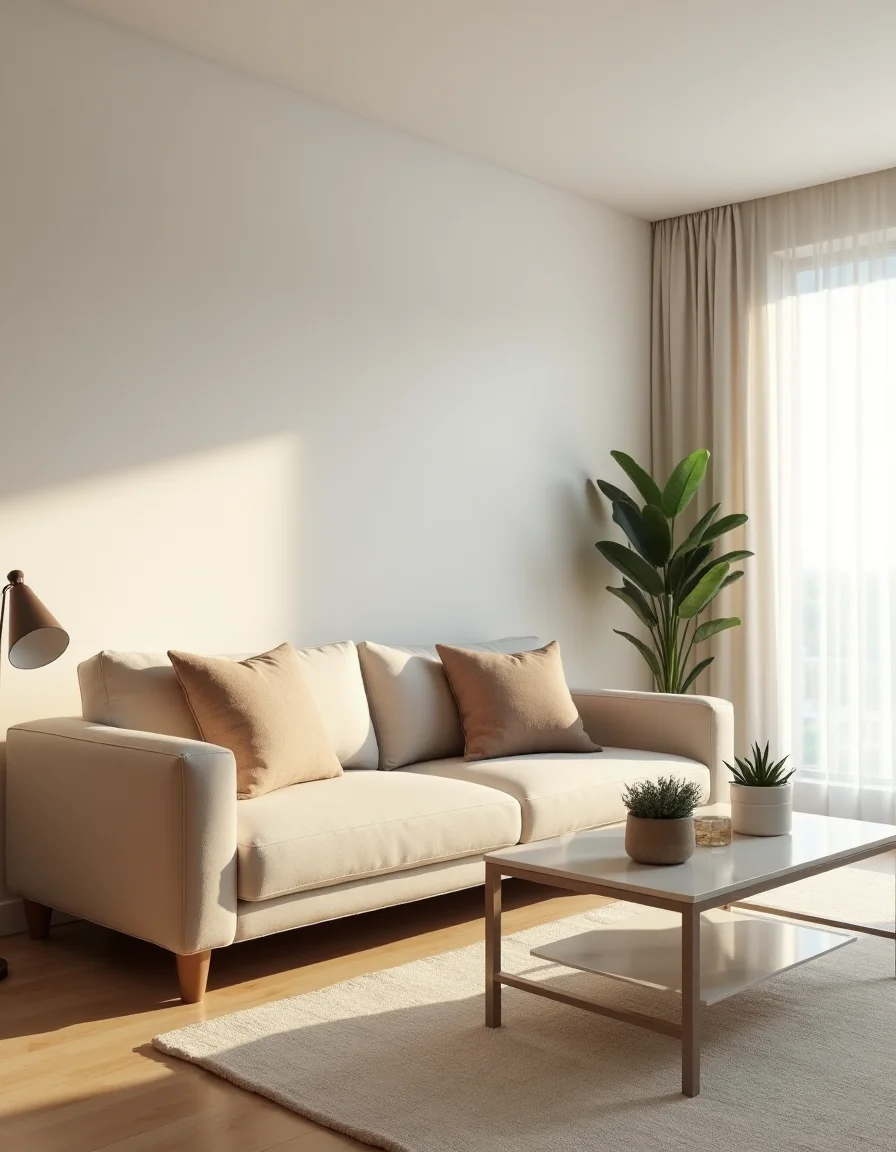 The living room is an embodiment of minimalist design, featuring clean lines and a serene ambiance. It showcases a low-profile sectional sofa in a soft beige fabric positioned against a pale white wall, subtly complemented by a pair of geometric accent pillows in muted earth tones. A sleek, rectangular coffee table made of lightweight glass sits at the center, with a single green succulent adorning its surface for a touch of nature. Natural light floods the space through sheer curtains hanging over a large window, illuminating the light oak hardwood floors and enhancing the uncluttered aesthetic. In one corner, a minimalist bookshelf holds a curated selection of books and a few carefully chosen decorative objects, while a matching floor lamp with a thin metallic base adds a warm glow during the evenings.