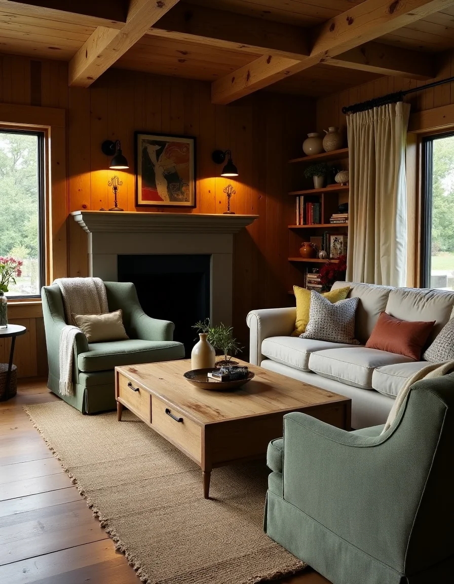 The living room embodies a warm rustic charm with its earthy color palette dominated by warm browns, deep greens, and soft grays. A large, weathered oak coffee table with a rough-hewn finish sits at the center, surrounded by a trio of mismatched upholstered armchairs adorned with various patterns in wool and cotton that convey a cozy, inviting vibe. A textured beige area rug lay beneath, layered with thick, wool throws draped carelessly over the furniture. The walls are embellished with reclaimed wood paneling, while handcrafted pottery and vintage books are placed on open wooden shelves, and soft warm lighting emitted from wrought iron lamps creates an intimate atmosphere throughout the space.