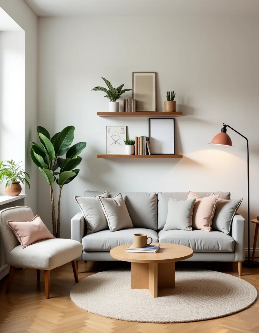 The living room embodies a warm Scandinavian design, with soft whitewashed walls that create an airy atmosphere. A plush light gray sofa, adorned with muted pastel cushions, is centrally placed to encourage conversation, complemented by a natural oak coffee table with clean lines. A handcrafted wool area rug in an ashy beige anchors the space, while a large potted fiddle leaf fig brings an organic touch to the corner. An elegant floor lamp with a minimalist design stands next to a cozy reading nook with a modern armchair and a small side table, creating a perfect spot for relaxation. Floating shelves made of reclaimed wood display art books and succulent plants, adding personal character and utilizing vertical space efficiently.