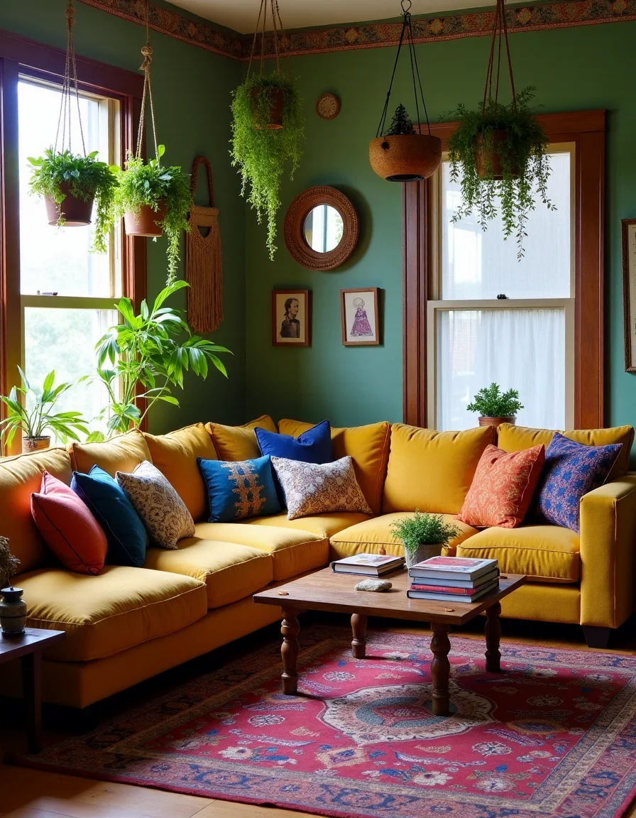 The living room exudes cozy bohemian vibes, accentuated by a vibrant mix of colors and textures. Richly patterned, oversized, faded Persian rugs cover the hardwood floors, providing a warm foundation. Nestled in one corner is a large, comfortable sectional couch in a muted mustard yellow, adorned with an array of mismatched patterned throw pillows in earthy tones and jewel-like colors. A collection of hanging macrame plant holders dangles from the ceiling, housing lush green ferns and trailing pothos that bring life to the space, while a rustic wooden coffee table, topped with an eclectic assortment of books and an aromatic candle, serves as the centerpiece. The walls are a tapestry of artful decor — framed travel photographs, woven wall hangings, and eclectic mirrors — contributing to the inviting, lived-in atmosphere.