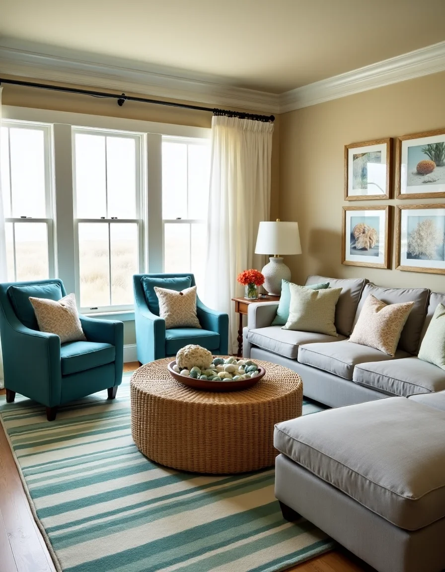 The living room embodies a serene seaside ambiance, with walls painted in soft sand beige that evoke coastal warmth. A plush striped carpet, mirroring the colors of ocean waves—a gentle blend of teal and ivory—extends across the space, inviting relaxation. In the center, a large, circular rattan coffee table topped with a driftwood-style tray holds an arrangement of sea glass and white pebbles. Flanking the table are a pair of deep-seated armchairs upholstered in ocean blue fabric, while a comfortable, light gray sectional sofa adorned with coral and sea shell-patterned throw pillows creates a natural flow around the room. Large windows draped with sheer white curtains bring in ample sunlight, highlighting a nautical-themed gallery wall featuring framed pictures of beach scenes and seashells, creating an inviting escape towards the outdoors.