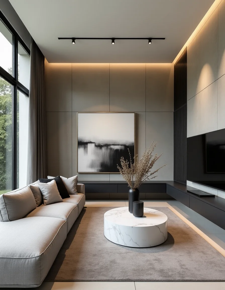 The living room is a breathtaking example of modern design, featuring a harmonious blend of concrete and sleek marble accents. The focal point of the room is a low-profile sectional sofa dressed in a soft gray fabric, positioned in an open L-shape to encourage conversation and comfort. A minimalist coffee table made of polished white marble sits at the center, topped with a single sculptural vase filled with dried eucalyptus for a touch of organic warmth. Behind the sofa, a textured concrete feature wall is adorned with a large abstract painting in monochromatic hues to enhance the clean lines of the overall design, while recessed lighting highlights its striking features. Floor-to-ceiling windows invite natural light to pour in, creating an airy ambiance, complemented by a floating media console in a matte black finish that houses a sleek flat-screen TV without overwhelming the space.