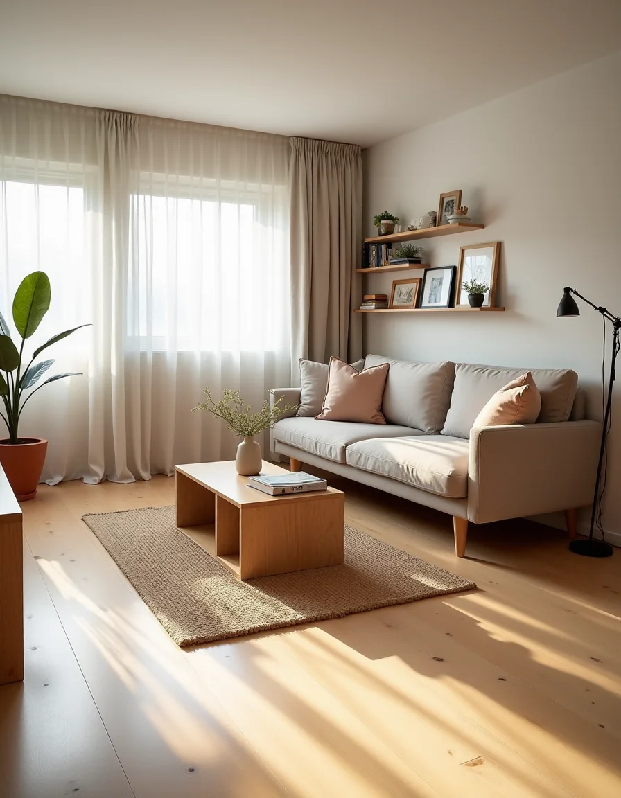 The living room features a spacious layout dominated by light-colored wooden flooring that enhances the airy feel typical of Scandinavian design. Centered in the room is a plush, neutral-toned sofa adorned with soft cushions in muted pastel shades, inviting relaxation. Next to the sofa, a minimalist coffee table made from reclaimed wood adds an eco-friendly aspect, while a handwoven jute rug underfoot brings texture to the space. To one side, a tall indoor plant in a terracotta pot breathes life into the corner, complemented by a sleek media console crafted from light oak, neatly arranged with contemporary decor pieces, including a few art-filled shelves overhead. The ambiance is completed with natural light streaming in through sheer curtains, which allow a gentle glow to soften the overall atmosphere, perfect for unwinding after a long day.