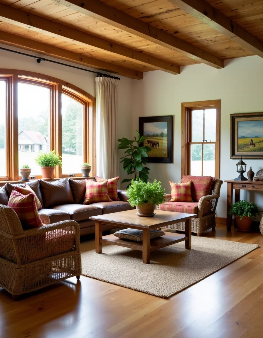The living room embodies a warm and inviting country style, characterized by rustic wooden beams adorning the ceiling and wide-plank hardwood floors in a light oak finish that reflect the natural light flooding through large, mullioned windows framed with simple white curtains. A large, cushy, brown leather sofa is positioned at the center, complemented by a pair of hand-woven wicker armchairs, each adorned with vibrant plaid cushions, creating a cozy conversation area. A vintage oak coffee table, distressed for added character, sits atop a soft jute area rug, while a side console table holds an assortment of potted herbs and an antique lantern for charm. Walls are decorated with pastoral-themed art, including landscapes and charming farm scenes, while an eclectic mix of ceramic vases and framed family photos complete the homely atmosphere, making it feel like a cherished retreat in the countryside.