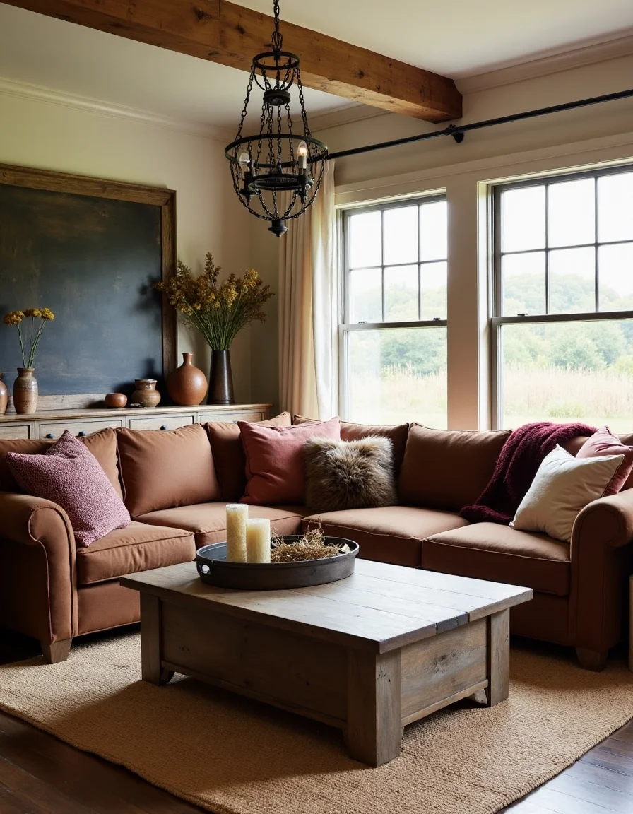 The living room exudes a warm rustic charm, anchored by a large, distressed wooden coffee table at the center, surrounded by a sumptuous L-shaped sectional sofa upholstered in earthy-toned wool fabric. Rich, deep burgundy throw blankets are casually draped over the back of the couch, while a pair of lush faux fur pillows bring a cozy touch. A reclaimed barnwood entertainment center stands against one wall, adorned with carefully curated vintage decor pieces, including ceramic vases filled with wildflowers and a couple of antique lanterns. The room is softly illuminated by a wrought-iron chandelier hanging from the exposed beam ceiling, and a handwoven jute rug lies underneath, adding texture to the beautifully layered space.