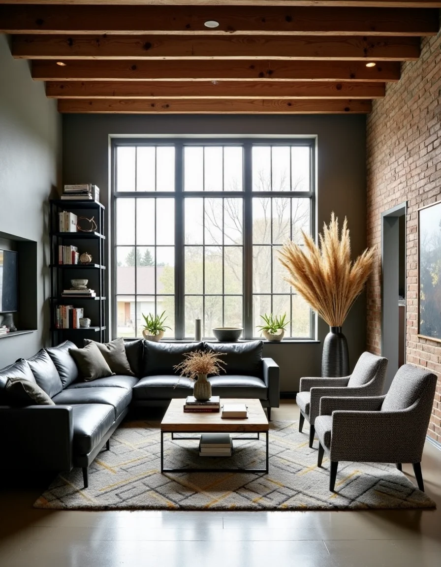 The living room showcases an industrial style defined by its exposed brick walls in a muted gray tone, complemented by the warm hues of distressed wooden beams overhead. A large, floor-to-ceiling ceiling window floods the space with natural light, highlighting the minimalist aesthetic. In the center, a sleek, charcoal-gray leather sectional couch is paired with a reclaimed wood coffee table, topped with a small stack of vintage books and a rustic metal vase holding dried grasses. To one side, bold black metal bookshelves laden with eclectic books and industrial decor pieces create a striking contrast against the lighter walls, while two stylish accent chairs in a houndstooth pattern provide additional seating, positioned to invite conversation around the intimate layout. Complete with a plush area rug featuring geometric patterns in shades of gray and muted gold, this living room offers a perfect blend of comfort and contemporary flair.