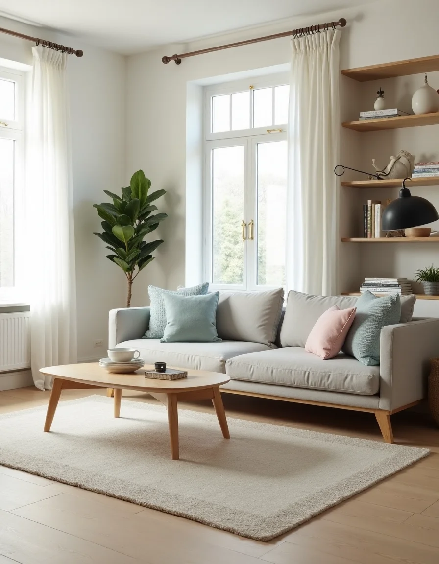 This Scandinavian-inspired living room exudes a warm and inviting ambiance with its light and airy feel. Fresh ivory walls serve as a perfect backdrop for crisp, pale wooden floors, creating a serene atmosphere. A cozy, mid-century modern light gray sofa adorned with soft pastels and textured light blue cushions is centered against one wall, while a sleek, natural wood coffee table sits upon a soft, cotton area rug featuring subtle geometric patterns. In one corner, a tall, elegant indoor plant in a white ceramic pot complements a minimalist black floor lamp, adding a touch of greenery, while the opposite side features open shelving filled with books and decorative trinkets that celebrate uncomplicated beauty. Large windows dressed with sheer white curtains allow for ample natural light, enhancing the room's fresh and airy feel.