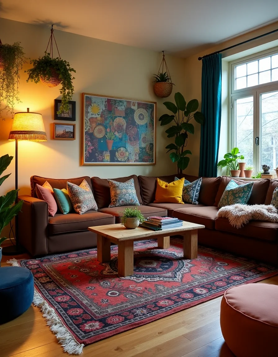 The living room embodies a vibrant bohemian style, featuring an array of ornamental rugs layered across the hardwood floor, featuring intricate designs in terracotta and teal colors. A large, oversized sectional sofa in a deep chocolate shade is adorned with an assortment of colorful throw pillows made from rich textiles, including silk and wool, boasting patterns of paisley and botanical prints. Vertical plants in woven baskets and hanging macramé planters adorn every corner, bringing life and a pop of green into the space, while wall-mounted shelves display an eclectic mix of art pieces, books, and souvenirs collected from travels around the globe. A low, reclaimed wood coffee table sits at the center, surrounded by poufs in mustard yellow and deep indigo, adding additional seating options, all illuminated by a warm, inviting floor lamp with a fringed shade that enhances the cheerful, relaxed ambiance.