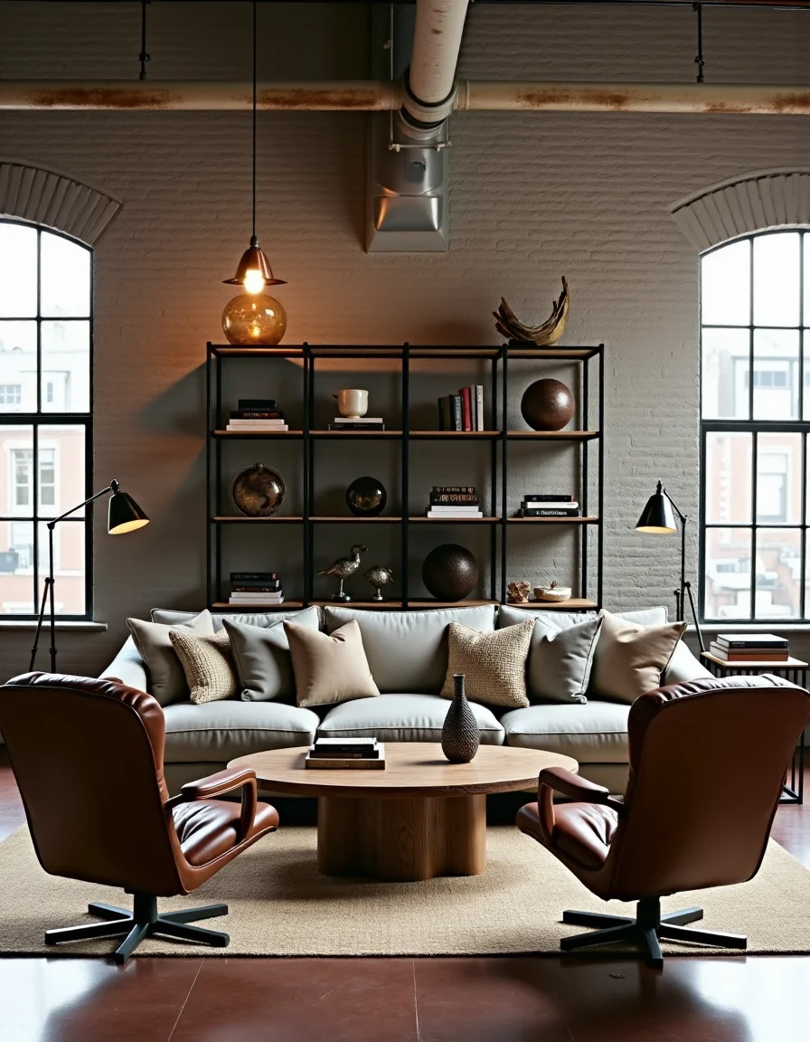 This industrial-style living room exudes a raw, urban charm, with exposed brick walls painted in a soft gray that contrast beautifully with the dark hardwood floors. Centrally positioned is a sturdy, reclaimed wooden coffee table, featuring a rough-hewn surface and cast-iron legs, surrounded by a pair of vintage leather armchairs in deep chestnut. A large, plush gray sofa occupies one side of the room, adorned with an array of burlap and knitted throw pillows, while a minimalist metal bookshelf displays an eclectic collection of books and unique decor pieces like rustic globes and metallic sculptures. Overhead, pendant lights with an aged copper finish hang from exposed piping, throwing warm light across the room and enhancing the industrial atmosphere.