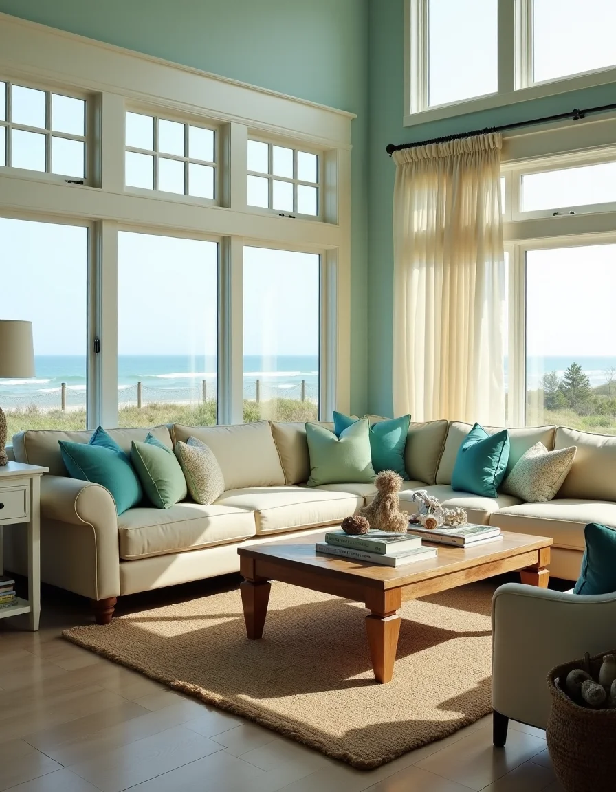 The living room embodies a serene seaside atmosphere, with large windows that stretch from floor to ceiling, allowing abundant natural light to flood the space while providing breathtaking views of the coastal landscape. In the center of the room, a cozy sectional sofa upholstered in light sand-colored fabric is adorned with a variety of plush seafoam green and ocean blue throw pillows, inviting relaxation. Nearby, a reclaimed wood coffee table perched on a jute area rug adds a rustic charm, its surface decorated with seashells and nautical-themed books. Complementing the beachy vibe, driftwood accent pieces sit atop a whitewashed side table, while nautical rope light fixtures cast a soft glow overhead. Soft, airy sheer curtains whisper in the gentle sea breeze, harmonizing perfectly with the crisp walls painted in subtle sky blue, creating a harmonious blend with the overall seaside design.