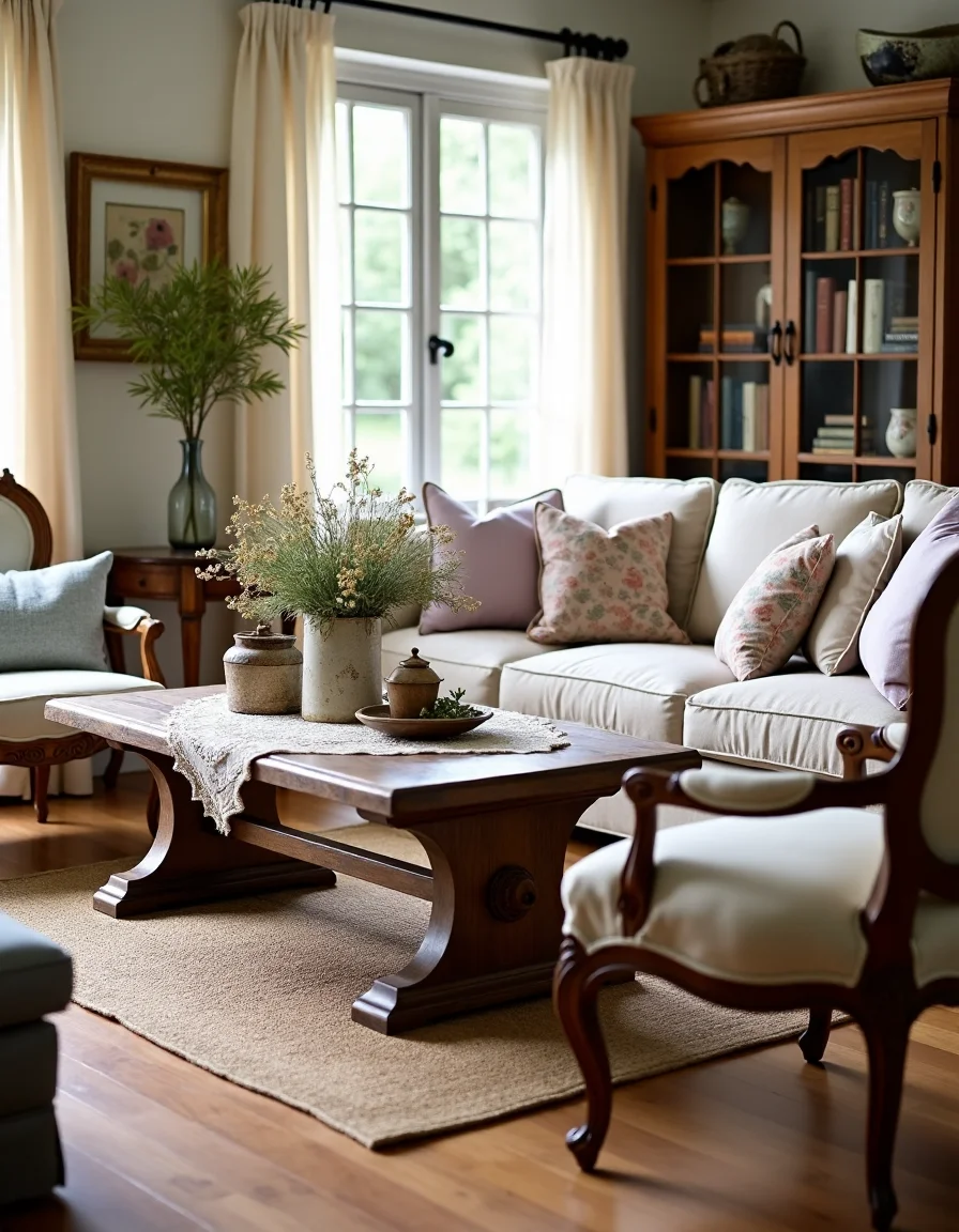 This charming country-style living room exudes a warm, inviting atmosphere, enhanced by ample natural light streaming through sheer, cream-colored drapes. The centerpiece is a large, distressed wooden coffee table adorned with a vintage lace tablecloth and a rustic vase filled with wildflowers, placed in front of a comfortable, oversized beige linen sofa strewn with an array of muted pastel cushions—blush, soft lavender, and powder blue. Flanking the sofa are a pair of antique wooden armchairs, their faded upholstery bearing intricate floral patterns, while an intricately carved oak bookcase brimming with well-loved novels rises against one wall. The hardwood floor, polished to a gloss but still exhibiting its natural grain, is softened by a vintage braided area rug in earth tones, completing the cozy and nostalgic atmosphere of this delightful country retreat.