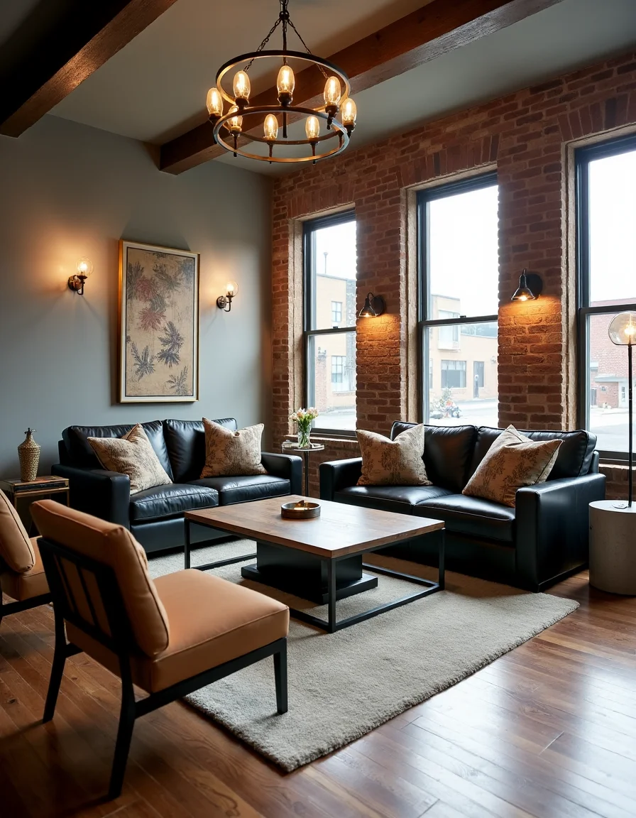 The living room exudes a chic industrial ambiance with exposed brick walls painted a soft gray, complementing the rich roasted hardwood flooring. In the center of the room, a large dark metal coffee table, featuring a distressed wooden top, anchors the seating arrangement made up of three sleek black leather sofas adorned with geometric patterned throw pillows in muted earth tones. Flanking the sofas, two sturdy steel-frame chairs with tan upholstery add a touch of warmth while a polished concrete side table, reminiscent of factory aesthetics, sits beside them. The lighting is softened by an oversized vintage-style pendant light made of wrought iron, hanging above, with additional warmth provided by decorative Edison bulb floor lamps positioned in the corners, giving the room an inviting yet undeniably edgy feel.
