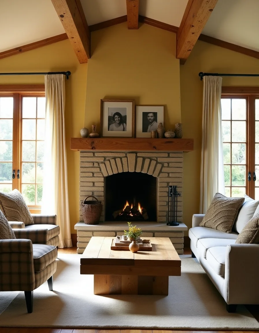 The living room exudes a cozy country charm with its rustic details and natural elements. A beautiful stone fireplace serves as the focal point, flanked by two comfortable, overstuffed armchairs upholstered in a soft, faded plaid fabric. A large, inviting sectional sofa, draped with knitted throws, is positioned in front of the fireplace, inviting guests to gather around. Natural light floods the room through wide, wooden-framed windows adorned with sheer, cream-colored curtains, while a handmade wooden coffee table—crafted from reclaimed oak—is placed at the center. The walls are painted a warm, buttery yellow, showcasing family photos in vintage frames and a collection of handmade ceramics displayed on open shelves, enhancing the homey ambiance.