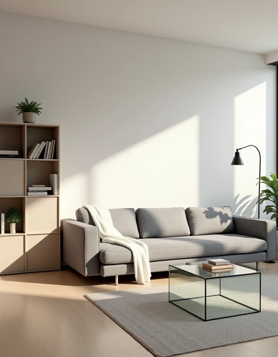 The living room embodies a serene minimalist style with a focus on negative space and multifunctional elements. A low-profile gray sectional sofa, sleek yet inviting, sits centrally on a pale wooden floor, paired with a simple white throw blanket. In front of the sofa, a clear, rectangular glass coffee table rests atop a muted woven area rug, offering transparency and lightness to the ambiance. To the left, a contemporary shelving unit with open compartments displays a curated selection of potted succulents and art books, emphasizing the art of decluttering while maximizing functionality. Soft, diffused lighting from an elegant pendant lamp illuminates the room, casting gentle shadows that enhance the sense of tranquility and openness.
