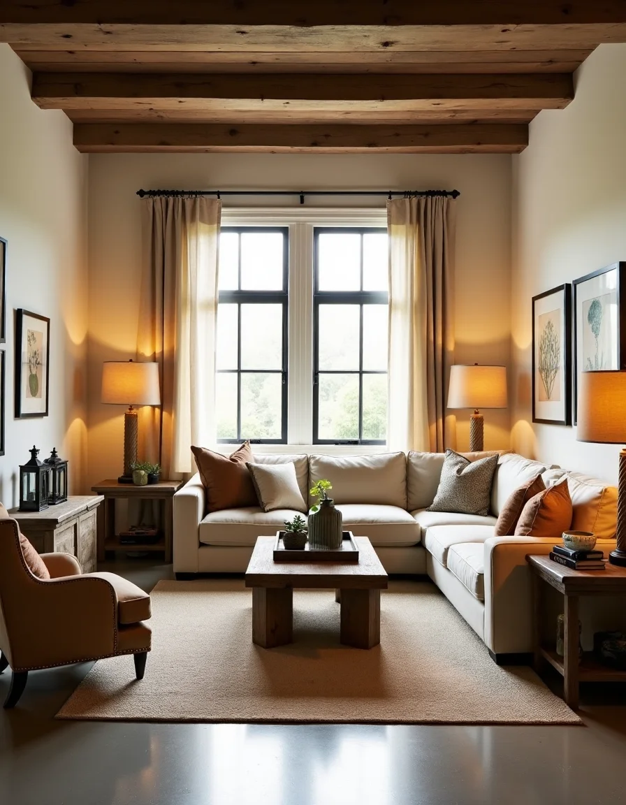 The living room embodies a rustic charm with its warm earth tones and a soothing palette of neutral shades. A large, plush beige sectional sofa occupies the center of the space, complemented by a distressed wooden coffee table with chunky legs and a weathered finish, which sits atop a woolen beige rug with subtle woven patterns. Flanking the sofa are two rustic armchairs upholstered in a light brown fabric that echoes the earthy vibes, while an antique wooden side table stands beside one, adorned with a vintage lantern and a potted succulent for a touch of greenery. The walls are adorned with a mixture of framed botanical prints in muted colors, while exposed wooden beams traverse the ceiling, allowing natural light to flow through large, curtain-less windows draped with sheer linen panels. The overall atmospheric glow is enriched by a combination of table and floor lamps with warm-hued shades set strategically around the room, ensuring a welcoming and cozy ambiance in the evening.