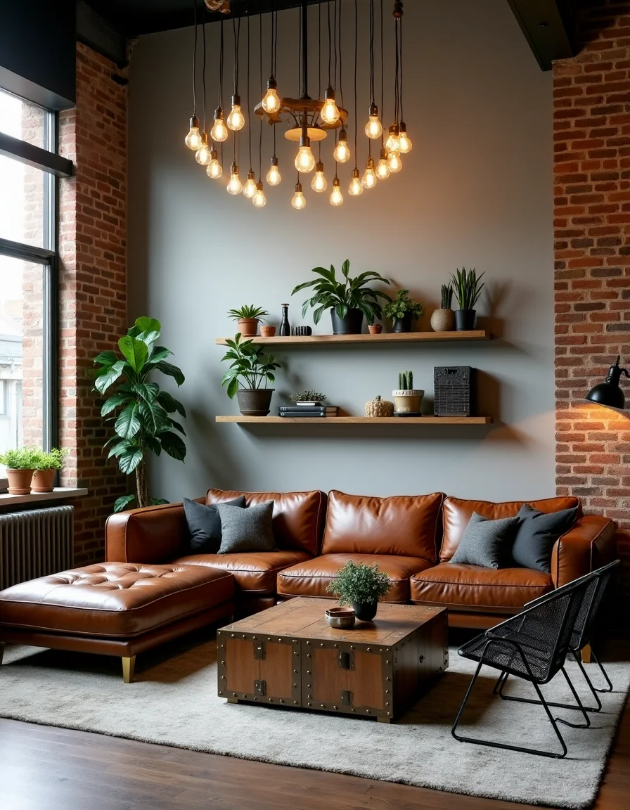 The living room exudes a modern industrial vibe with exposed brick walls painted in a soft gray hue, providing a rustic backdrop. At the centerpiece, a large, deep-brown leather sectional sofa with brushed brass legs is arranged in an L-shape, adorned with cozy charcoal throw pillows. A reclaimed wood coffee table with metal rivet accents sits in the middle, surrounded by a pair of black wrought iron accent chairs. The ambient lighting comes from a series of Edison bulb pendant lights that hang gracefully from a high ceiling, complemented by a vintage metal floor lamp by the sofa. To add warmth, potted greenery, including a tall snake plant and small succulents, intermingle on wooden shelves made from reclaimed material, providing the perfect contrast against the industrial elements.