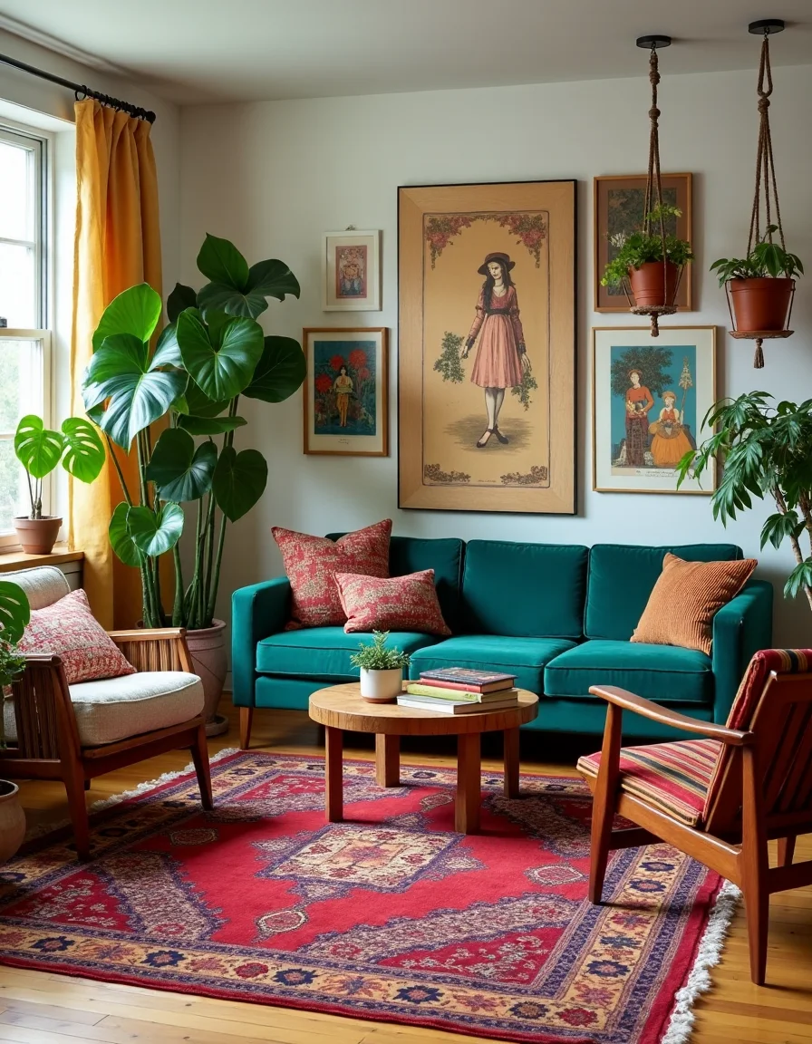 The living room exudes a vibrant bohemian ambiance where eclecticism meets comfort. A large, intricately woven Persian rug in shades of deep red and gold sprawls across the hardwood floor, setting a warm foundation. Surrounding it are mismatched furniture pieces including an oversized velvet teal sofa positioned against the wall, adorned with colorful patterned throw pillows. To the right, a mid-century modern teak coffee table is topped with an assortment of books and a small potted succulent, while above the table hangs a gallery wall of striking artwork featuring abstract pieces and vintage prints framed in natural wood. Lush plants of various sizes, including a tall fiddle leaf fig and cascading pothos, add a refreshing touch, harmonizing the entire space with nature's greens, while decorative macrame hangers dangle from the ceiling, holding vibrant terracotta pots.