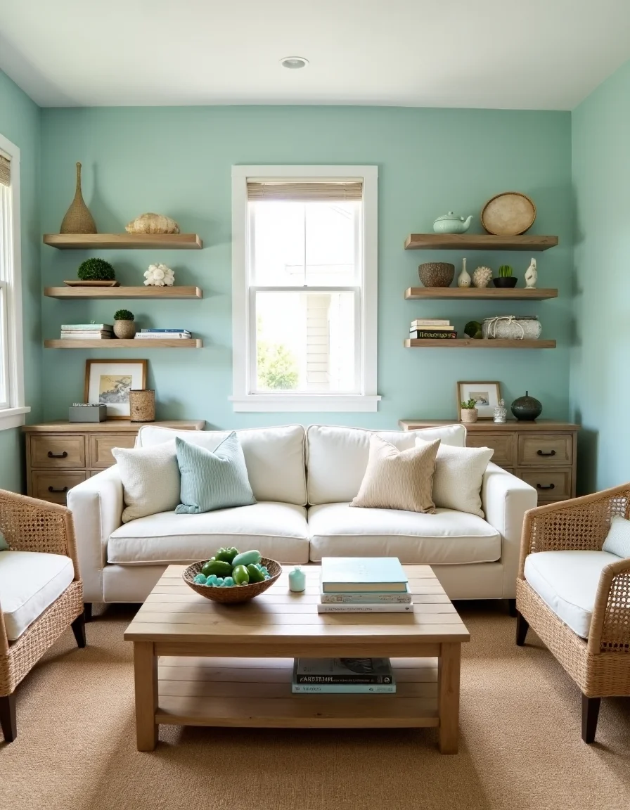 The seaside-inspired living room features a spacious layout with soft hues reminiscent of the ocean. A large, white linen couch is centered against a backdrop of pale aqua walls, inviting relaxation. To the left of the couch, a natural driftwood coffee table holds a few sea glass decorative items and a stack of nautical-themed books. Accenting the space, two rattan armchairs with light beige cushions are positioned across from the couch, while a jute area rug anchors the furniture ensemble. The decor is completed with weathered wooden shelves on the walls, displaying coastal art pieces, a few potted succulents, and a collection of seashells that evoke the tranquil essence of a beach getaway.