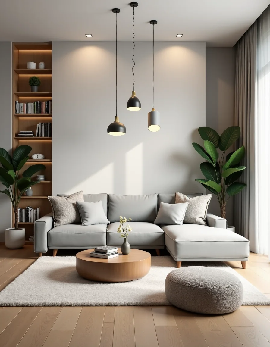 The modern living room features a sleek, minimalist design with a soft gray color palette accented by bright white and natural wood elements. A large, comfortable light gray sectional sofa is positioned in the center, adorned with a few high-quality throw pillows in various textures, adding depth without overwhelming the simplicity of the design. Directly opposite the sofa, a low-profile walnut coffee table with clean lines sits on a plush, light beige area rug that defines the seating space. Flanking the room, two tall bookshelves showcase curated selections of books and decorative objects, while a few potted green plants breathe life into the overall simple aesthetic. The lighting is provided by a trio of modern pendant lights with minimalistic designs, creating warm spots of illumination throughout the space, harmonizing with the neutral tones and enhancing the serene ambiance.