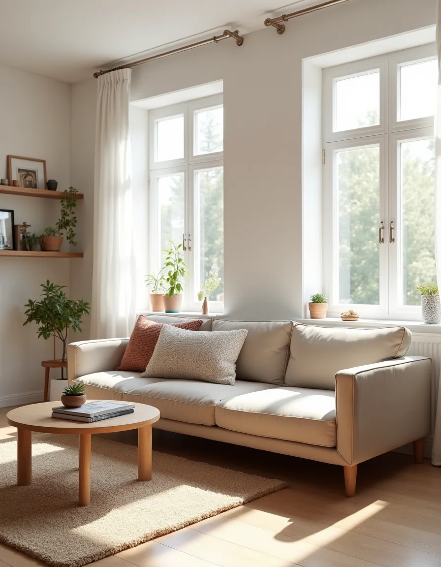 The living room features a bright and airy Scandinavian design, illuminated by natural light streaming in through large, unadorned windows. Light oak flooring complements the pale-toned walls, which are painted in a soft white hue, enhancing the spacious feel of the room. A minimalistic, low-profile beige sofa sits in the center, adorned with textured knit throw pillows in muted pastels. To the side, a round light wood coffee table displays a couple of artful magazines and a small succulent plant. Additions include a cozy woven rug that anchors the seating area, wooden shelves holding carefully curated decor elements, and plush, white curtains hung casually to frame the windows, creating a serene yet functional living space.