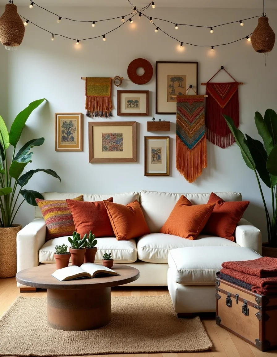 The living room radiates a cozy bohemian vibe, adorned with an inviting mix of textures and colors. A large, overstuffed, cream-colored sofa is set against a backdrop of whitewashed walls, accentuated by a variety of patterned throw pillows in earthy tones of terracotta, rust, and deep greens. A large jute rug lies beneath a reclaimed wood coffee table, artfully decorated with a cluster of succulents in handmade ceramic pots and an open book on the mystical lore of travel. String lights drape above the space, casting soft illumination over an eclectic gallery wall of ethnic prints, framed textiles, and colorful macramé wall hangings that echo the spirit of wanderlust. Potted plants in every corner breathe life into the room, while a vintage trunk serves as additional storage, topped with a woven basket filled with cozy blankets, encouraging relaxation and intimacy.