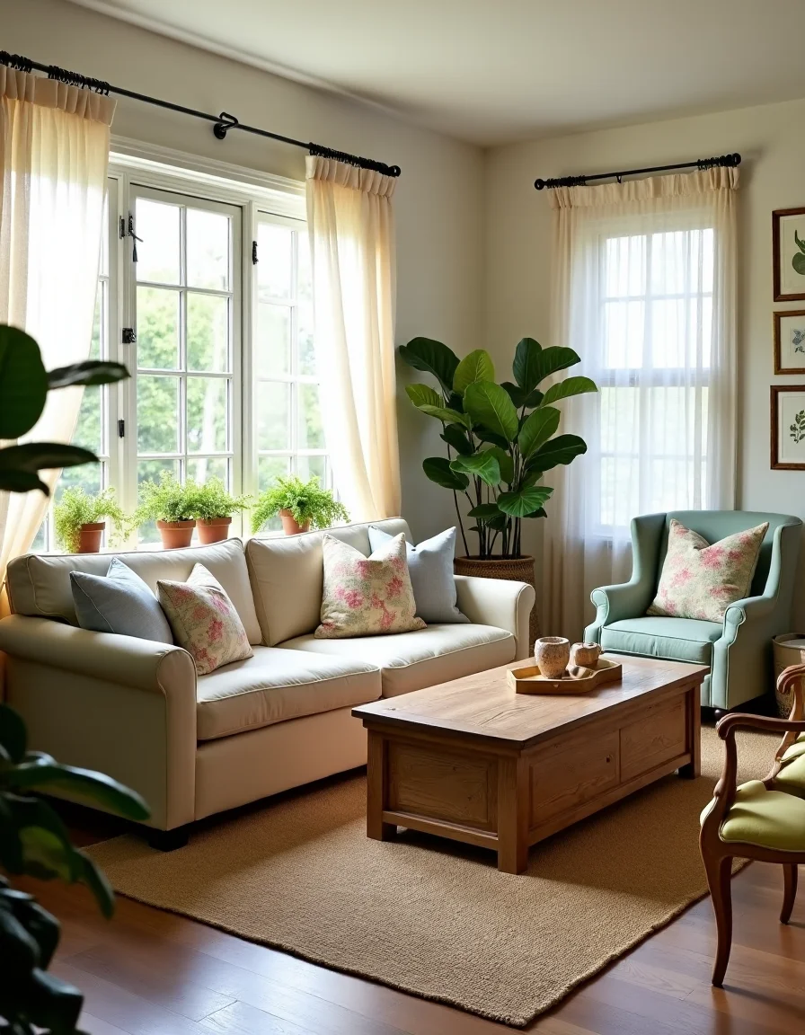 The living room exudes a charming country style, characterized by a harmonious blend of handcrafted furniture and muted pastel colors that impart a warm and inviting atmosphere. A large, overstuffed beige linen sofa sits against the main wall, adorned with an array of distressed floral throw pillows in soft blues, creams, and blush pinks. Opposite the sofa, a rustic oak coffee table, with visible wood grain and a slight patina, is surrounded by mismatched vintage armchairs painted in pastel greens and yellows, evoking a sense of nostalgic coziness. Natural light pours in through wide, sheer lace curtains that frame a pair of large windows, while a handwoven jute rug anchors the space, and several potted houseplants strategically placed around the room add a refreshing touch of greenery and life. The walls are decorated with framed family photos and whimsical nature prints, all contributing to a feel of comfort and familiarity, perfect for leisurely family gatherings or serene afternoons spent reading.