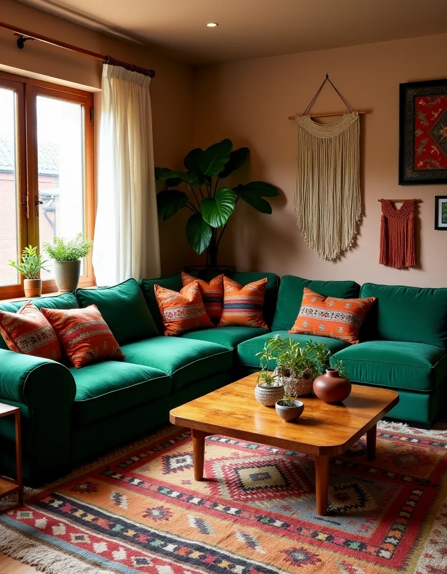 The living room boasts a warm and inviting bohemian style, with a rich tapestry of textures and ethnic decor that brings life to the space. A large, oversized, low-profile sectional sofa in a deep emerald green velvet fabric dominates one side, adorned with an array of patterned throw pillows displaying vibrant hues of orange, indigo, and deep reds that feature geometric designs and tribal motifs. Surrounding the sofa, an assortment of handmade woven rugs in varying sizes and colors adds depth to the room while softly grounding the furniture. Near a corner, an intricate wooden coffee table with inlaid designs holds scattered plant terrariums and artisanal pottery, while macramé wall hangings drape down from the walls alongside framed ethnic art pieces, enveloping the space in a cozy, eclectic atmosphere filled with cultural charm.