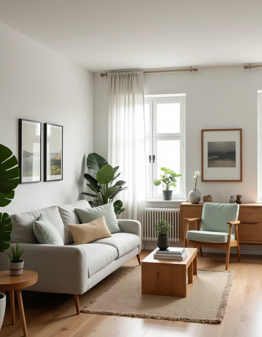 This Scandinavian-style living room exudes simplicity and tranquility, featuring a palette of soft whites and light pastels. A plush, light gray fabric sofa is positioned centrally against a pristine white wall adorned with minimalist art featuring natural landscapes. To the left of the sofa, a simple wooden coffee table made of warm oak showcases a small potted plant and a stack of coffee table books, while a cozy jute rug lays beneath them, adding texture. Soft natural light streams in through sheer curtains framing a large window, illuminating a stylish mid-century armchair upholstered in a gentle sage green, and a wooden console table in the corner displays an assortment of decorative ceramics in muted tones. The entire space is harmoniously accented with leafy indoor plants placed strategically throughout, contributing to a fresh, organic feel that invites relaxation.