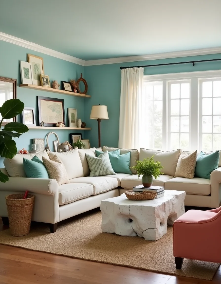 This tranquil seaside living room exudes a sense of calm and comfort with its soft blue walls reminiscent of the ocean sky. Plush seating dominates the space; a large light beige sectional sofa wrapped in thick cotton fabric invites relaxation, adorned with an array of seafoam green and coral throw pillows. A chunky, whitewashed coffee table made from reclaimed driftwood sits at the center, surrounded by a hand-woven jute rug that adds texture to the floor. Decorated shelves flaunt curated nautical-themed decor, including a collection of seashells and framed vintage maps, while large windows draped in sheer white curtains allow natural light to flood the room, enhancing its airy atmosphere. A couple of lush houseplants, like a fiddle leaf fig or snake plant, add vibrant greenery, completing this casual coastal aesthetic.