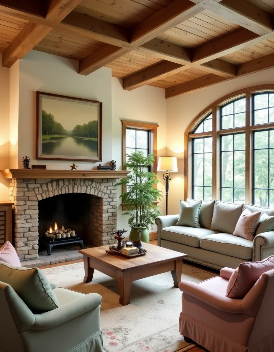 This cozy country-style living room radiates warmth with its rich wooden elements and muted pastel accents. A rustic, reclaimed wood coffee table is centered on a soft, cream-colored area rug adorned with subtle floral patterns. A stone fireplace dominates one wall, its mantel decorated with vintage trinkets and a large, framed landscape painting in soft greens and mauves above it. Surrounding the fireplace are plush, overstuffed chairs upholstered in dusty rose fabric, paired with a fabric-covered loveseat in a light sage green, adding to the inviting ambiance. The room is illuminated by wrought iron floor and table lamps, their warm light reflecting off the wooden beams of the ceiling, creating a serene and homey atmosphere.