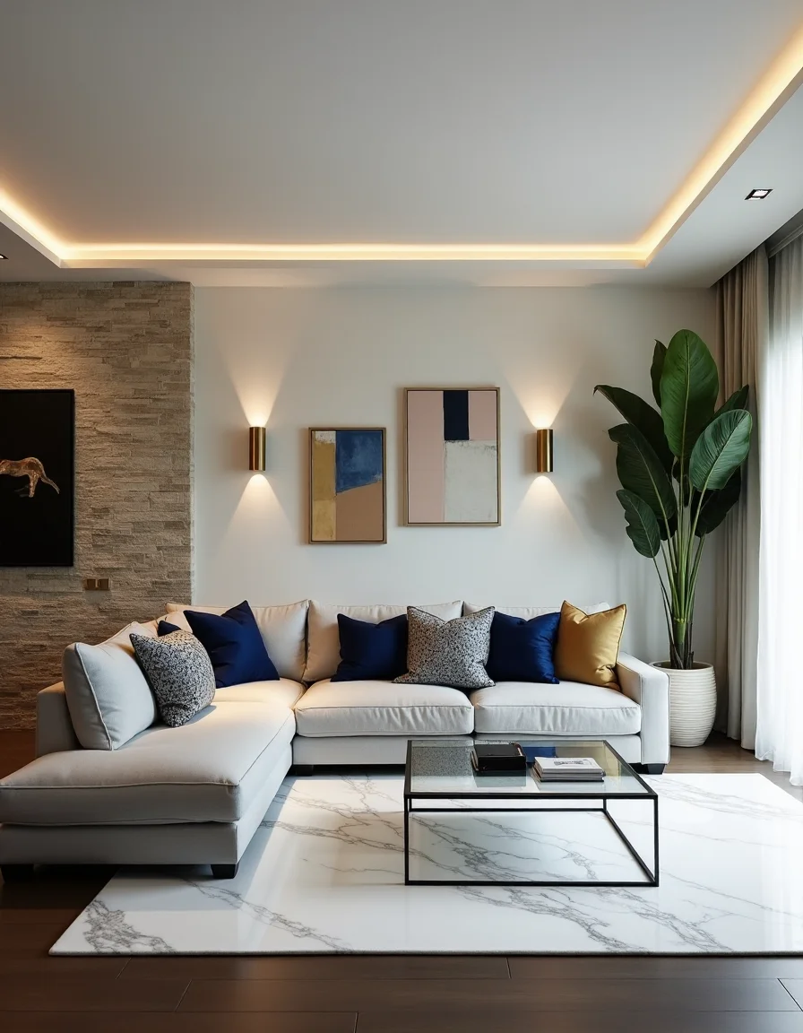This modern living room blends luxurious materials with a minimalist aesthetic. A sleek light gray sectional sofa is positioned in the center of the room, adorned with plush, geometric-patterned throw pillows in blue and gold hues. Opposite the sofa, a large, rectangular glass coffee table sits atop a stunning white marble area rug that creates a stunning contrast against the dark hardwood floor. To the right, a striking stone feature wall showcases abstract art pieces, while tall indoor plants in contemporary pots add a touch of greenery, completing the serene ambiance enhanced by strategically placed warm LED lighting fixtures in stylish metallic finishes.