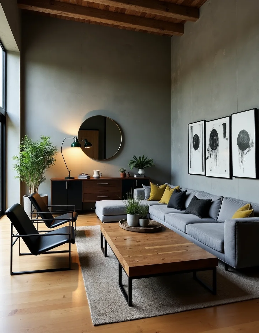 The living room embodies a striking industrial style with raw concrete walls that seamlessly blend into polished hardwood floors, giving the space an urban edge. A large, rectangular reclaimed wood coffee table, slightly weathered yet charming, occupies the center, surrounded by a pair of black leather lounge chairs with metal frames that accentuate the rugged aesthetic. A vintage green metal floor lamp stands in one corner, casting a warm glow over the room, while an oversized, minimalist grey sofa hugs the opposite wall adorned with abstract black-and-white art pieces that reflect the industrial theme. To enhance the ambiance, potted succulents sit atop various surfaces, adding a touch of greenery against the stark color palette of blacks, greys, and whites.