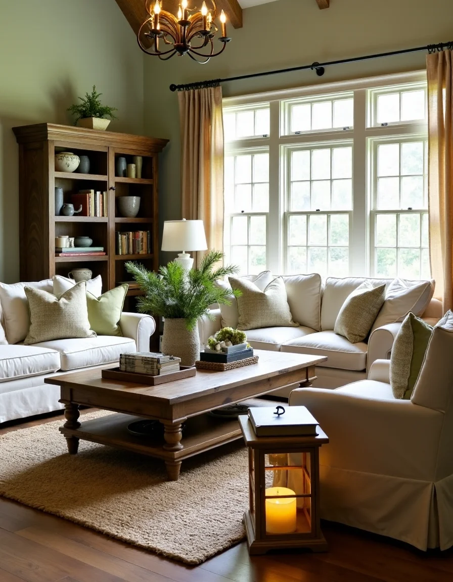 The living room exudes a warm, country charm, blending earthy tones of muted greens, soft browns, and creamy whites throughout the space. A large, distressed coffee table made from reclaimed wood anchors the center of the room, surrounded by a mix of slipcovered sofas and armchairs in natural linen fabrics, generously adorned with plaid and floral patterned throw pillows. To the left, a rustic bookshelf brimming with handcrafted pottery and books creates an inviting focal point, while a handmade woven area rug in shades of taupe and cream adds texture and coziness to the wood floor. Soft, warm lighting is provided by a wrought iron chandelier overhead, complemented by a few strategically placed decorative lanterns emitting a gentle glow, enhancing the inviting ambiance of the room.