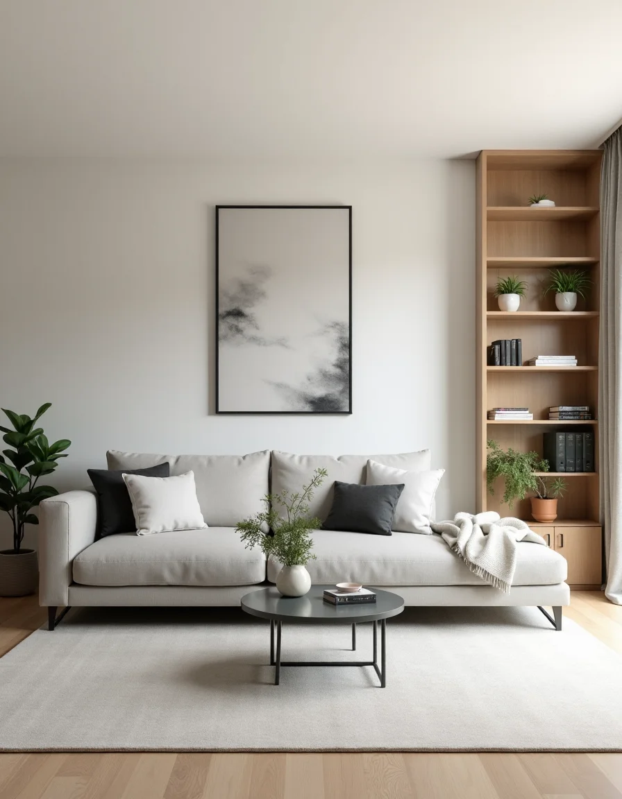 This minimalist living room features an open layout that embraces negative space while exuding comfort through streamlined furniture. A sleek light grey sofa sits against the wall, its clean lines and geometric shape inviting relaxation. A glass coffee table with a simple, unobtrusive design is centered in front of the couch, allowing for easy movement around the space. Adjacent to the sofa, a modular bookshelf in natural wood houses a selection of curated decor pieces and plants, providing warmth without cluttering the area. Finishing touches like a single large abstract canvas in monochromatic tones are mounted above the sofa, enhancing the serene ambiance and highlighting the room's tranquility.