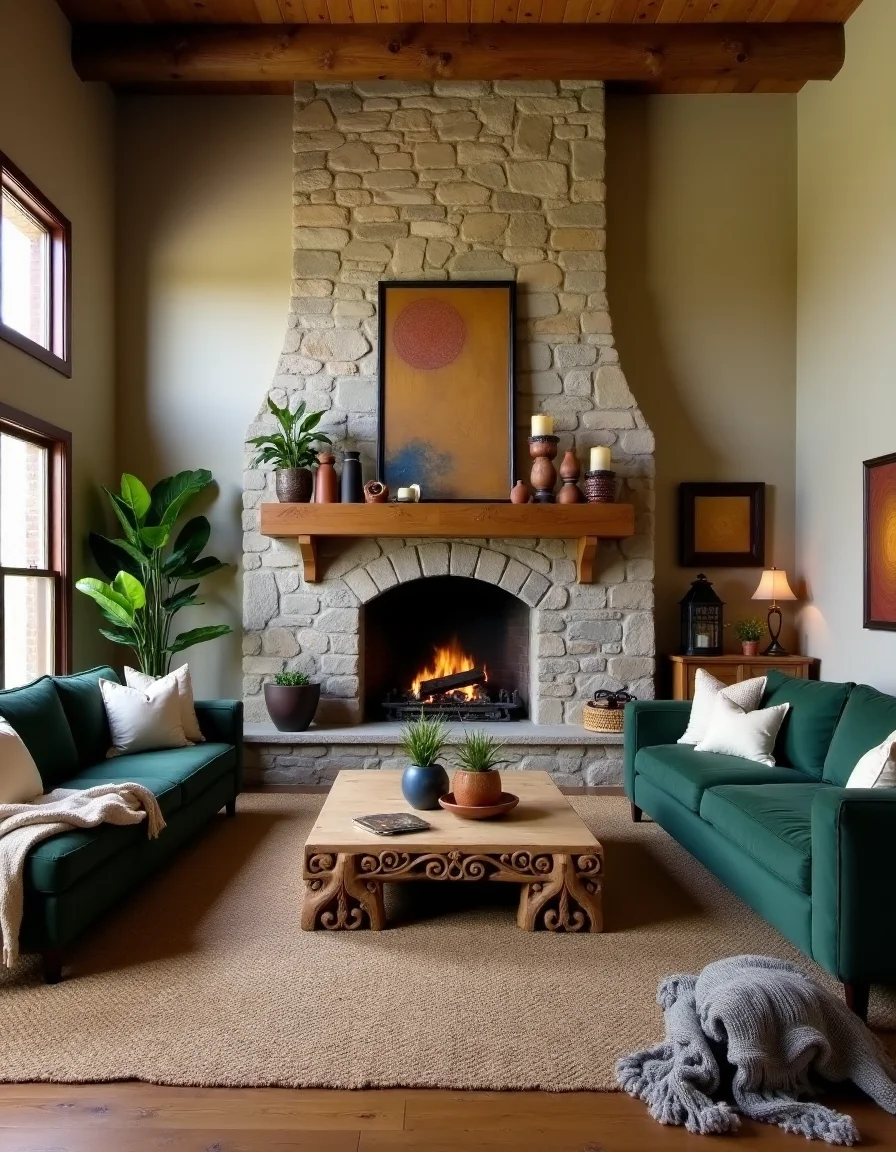 This inviting rustic living room features a large, centered stone fireplace, complete with a weathered wooden mantel adorned with handcrafted pottery and a collection of artisanal candleholders, lending a warm glow to the space. The walls are painted a soft taupe, providing a soothing backdrop for the abundant earth tones throughout, including a deep forest green sectional sofa covered in a soft, textured fabric. In front of the sofa is a reclaimed wood coffee table, intricately carved, surrounded by scattered handmade woolen throws and a plush, braided jute area rug. As accents, large indoor plants in terra-cotta pots and vintage art pieces framed in rustic wood bring life to the corners, while rustic lanterns on side tables add an additional layer of cozy charm to the ambiance.