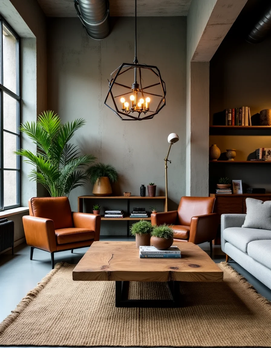 The living room exudes a robust industrial charm, featuring raw concrete walls treated with a textured finish that complements the exposed metal beams and piping overhead. A large, solid reclaimed wood coffee table occupies the center of the room, its rugged surface contrasted by sleek black iron legs, while vintage leather armchairs in a rich cognac hue invite comfortable seating around it. An eclectic array of decor adorns the space, including a large geometric pendant light with Edison bulbs hanging from the ceiling, and a floor lamp with an antique copper finish that adds warmth. To anchor the area, a hand-woven jute rug sits beneath, lending an organic touch to the otherwise raw aesthetic, while potted succulents and industrial-style shelves showcasing books and artifacts add character and a splash of color, enhancing the overall cozy yet edgy ambiance.