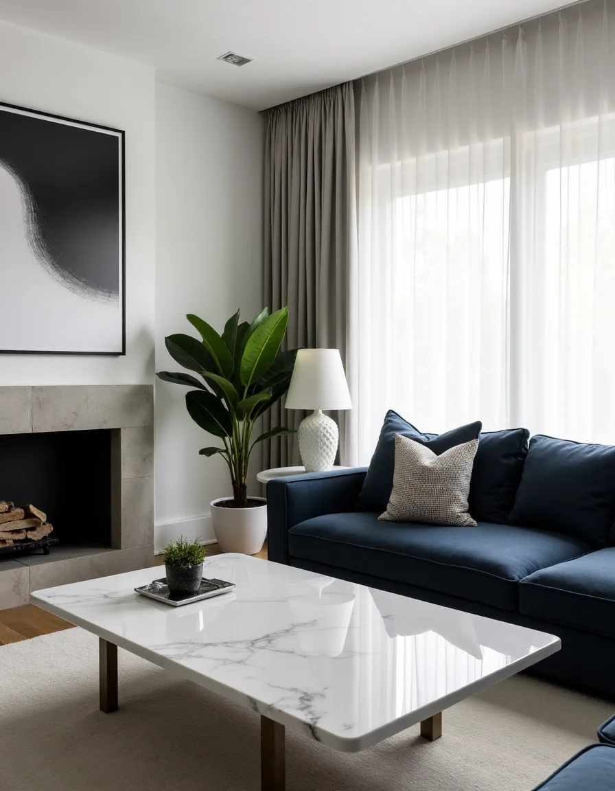 The living room exudes a sleek modern aesthetic, enveloped in a refined color palette of cool grays and crisp whites. A luxurious glossy white marble coffee table sits at the center, anchored by a deep navy sectional sofa adorned with plush, oversized pillows in varying textures, including velvet and woven fabric. An elegant glass side table featuring a geometric design stands beside the sofa, complemented by a minimalist white desk lamp with a tempered glass base. Soft ambient light pours in through a large floor-to-ceiling window adorned with sheer white drapes, while an eye-catching abstract black and white photograph hangs above a low stone fireplace, blending seamlessly with the modern decor. Finally, lush greenery is introduced with a tall potted snake plant placed near the entrance, bringing life to the chic, sophisticated space.