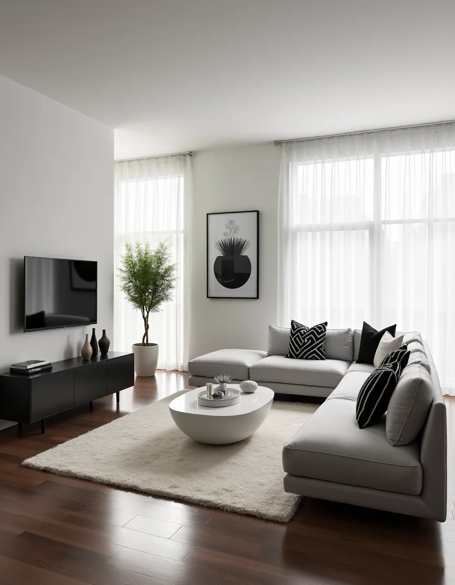 This minimalist living room embodies a seamless blend of functionality and elegance, featuring a sleek, pale gray sectional sofa positioned in the center, adorned with black and white geometric patterned throw pillows. A low-profile, white coffee table with rounded edges sits atop a soft, light beige area rug, providing a neutral balance against the polished dark wood floor. Against one wall, a contemporary multimedia unit in matte black houses an ultra-slim TV and several minimalistic decorative items, while an abstract monochrome painting hangs above to create a focal point without overpowering the space. Natural light pours through sheer white curtains on large windows, enhancing the airy ambiance and drawing attention to a single potted snake plant in the corner, injecting a subtle hint of greenery into the monochrome palette.